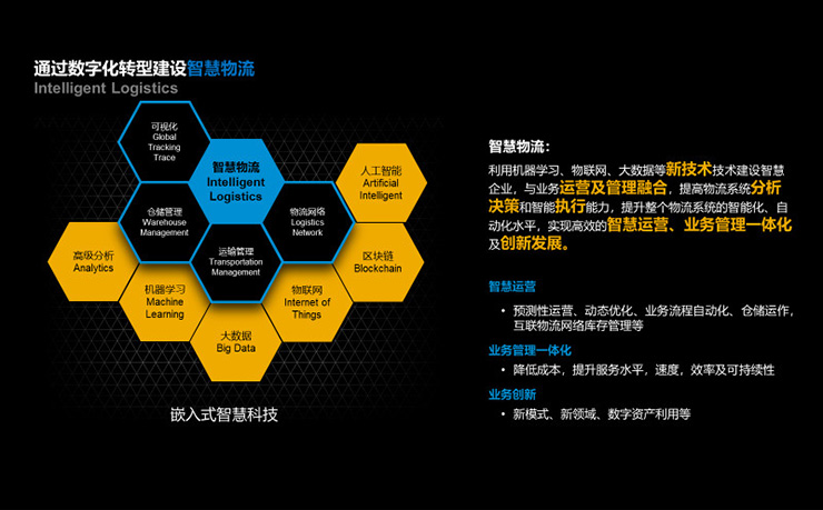 建設智慧物流。利用創新技術建設智慧企業,提高物流系統分析決策和智能執行能力,提升行業智能化、自動化、柔性水平,實現業務管理一體化及創新發展。